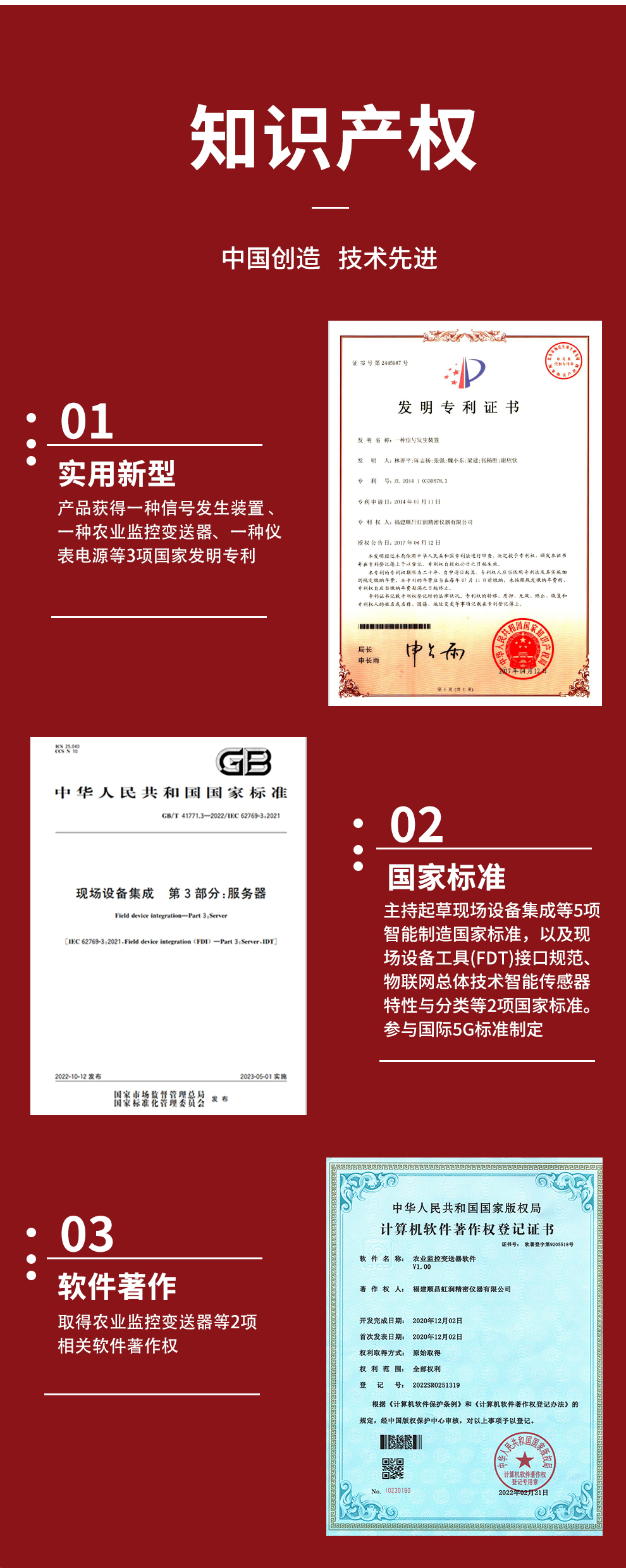 虹潤公司是專業(yè)生產(chǎn)環(huán)境監(jiān)測(cè)儀表的國家專精特新“小巨人”企業(yè)。生產(chǎn)的氧氣變送器,具有采用電化學(xué)原理,響應(yīng)靈敏,準(zhǔn)確度高,低功耗,模擬量變送輸出或RS485通訊等特點(diǎn)。產(chǎn)品獲得一種農(nóng)業(yè)監(jiān)控變送器、一種儀表電源等2項(xiàng)實(shí)用新型專利,主持起草現(xiàn)場(chǎng)設(shè)備集成等5項(xiàng)智能制造國家標(biāo)準(zhǔn),以及現(xiàn)場(chǎng)設(shè)備工具(FDT)接口規(guī)范、物聯(lián)網(wǎng)總體技術(shù)智能傳感器特性與分類等2項(xiàng)國家標(biāo)準(zhǔn),參與國際5G標(biāo)準(zhǔn)制定,取得農(nóng)業(yè)監(jiān)控變送器等3項(xiàng)相關(guān)軟件著作權(quán)。產(chǎn)品廣泛應(yīng)用于機(jī)房、配電站、地下車庫、工廠倉庫、食品儲(chǔ)存、養(yǎng)殖場(chǎng)、果蔬林園等環(huán)境場(chǎng)合對(duì)氧氣濃度的檢測(cè)。
