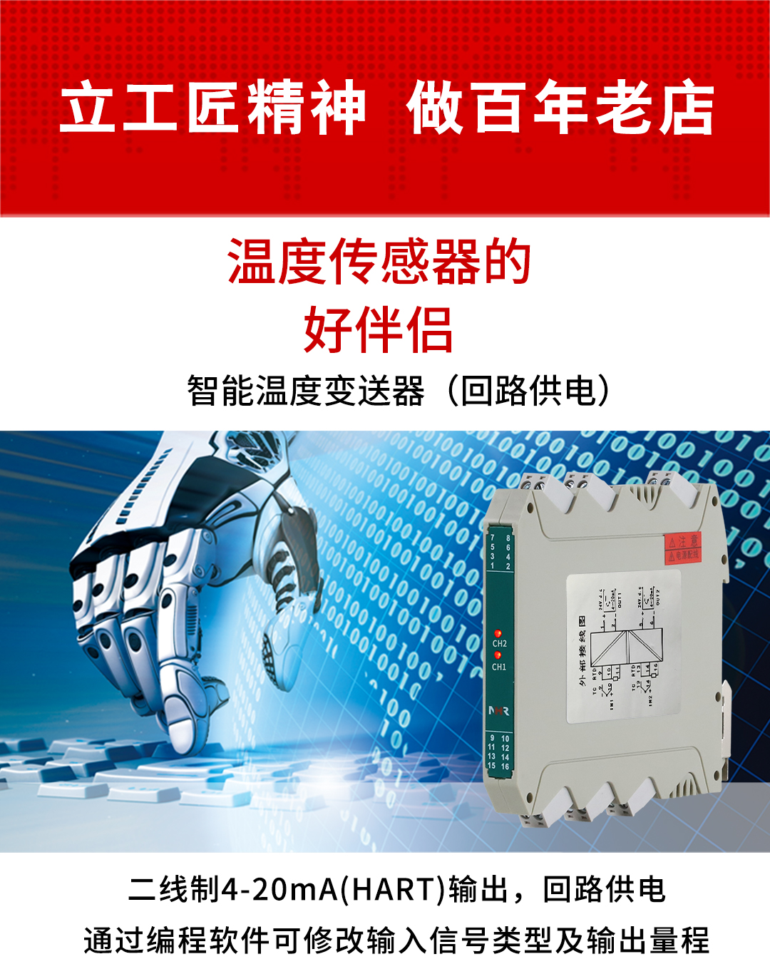 虹潤(rùn)公司是專業(yè)生產(chǎn)溫度變送器的國(guó)家專精特新“小巨人”企業(yè)。生產(chǎn)的HART智能溫度變送器,具有適配各類溫度傳感器,通過編程線修改輸入信號(hào)類型及量程,兼容HART的兩線制4-20mA信號(hào),回路供電等特點(diǎn)。該產(chǎn)品不僅通過HART基金會(huì)認(rèn)證、德國(guó)萊茵 CE 認(rèn)證與 SIL 功能安全認(rèn)證,還獲得具備減震抗干擾能力的溫度變送器、信號(hào)隔離器、一種二端子模塊、無源信號(hào)隔離器等4項(xiàng)國(guó)家發(fā)明專利,主持起草物聯(lián)網(wǎng)智能溫度儀表、現(xiàn)場(chǎng)設(shè)備工具(FDT)接口規(guī)范、工業(yè)過程測(cè)量和控制系統(tǒng)用溫度變送器等3項(xiàng)國(guó)家標(biāo)準(zhǔn),以及通信系統(tǒng)多通道數(shù)據(jù)采集控制終端規(guī)范軍用標(biāo)準(zhǔn),參與國(guó)際5G標(biāo)準(zhǔn)制定,取得HART溫度變送器、智能溫度變送器等5項(xiàng)相關(guān)軟件著作權(quán)。產(chǎn)品廣泛應(yīng)用于石油、化工、電力、冶金、制藥、食品、水處理等各種工業(yè)領(lǐng)域。