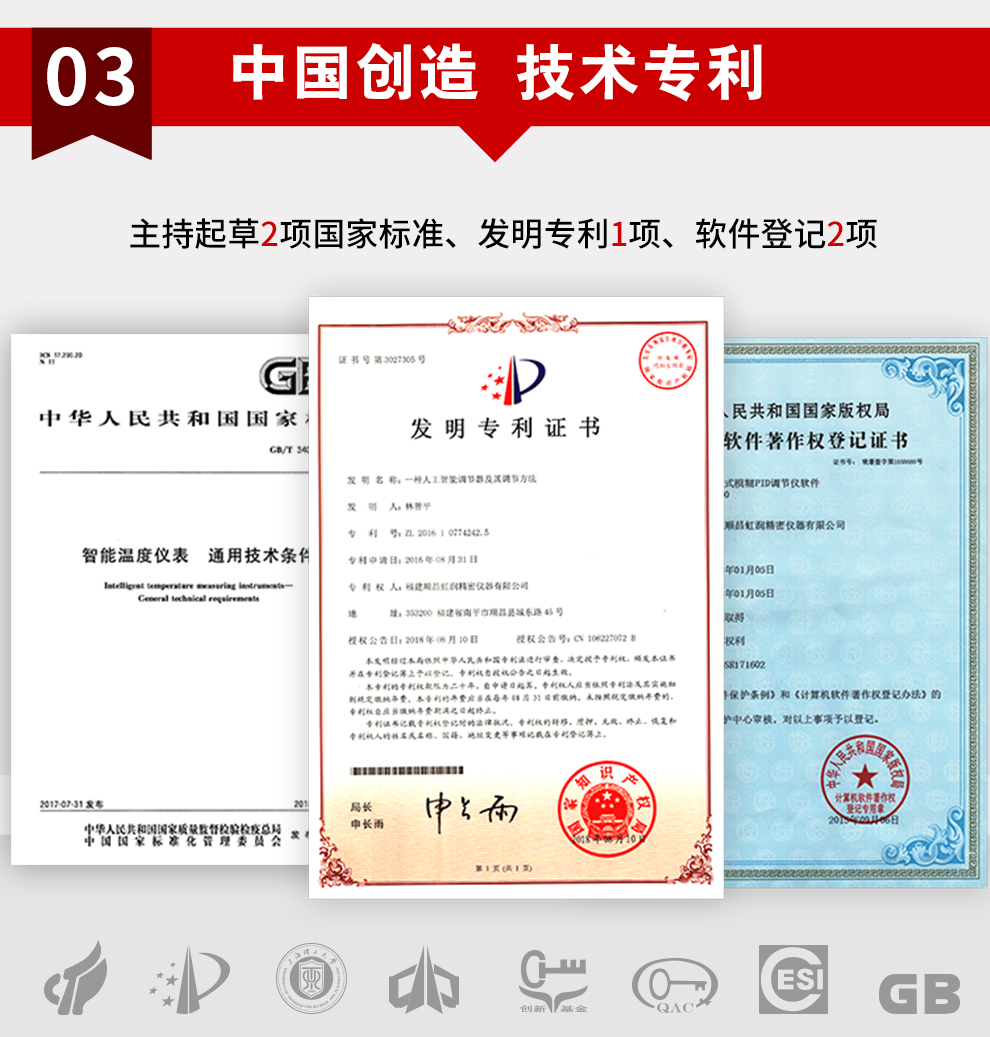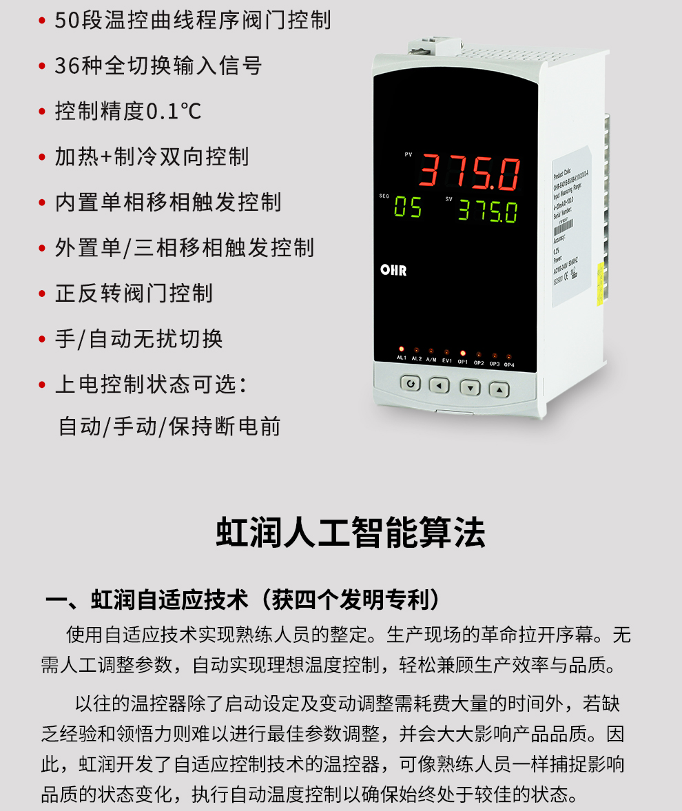 虹潤公司是專業(yè)生產(chǎn)溫控器的國家專精特新“小巨人”企業(yè)。生產(chǎn)的程序閥門溫控器,具有50段溫控程序控制,真正人工智能算式,無需人工整定參數(shù),控制精度可達±0.1°C,加熱制冷雙向控制等特點。產(chǎn)品獲得模糊PID控制儀及控制方法、人工智能調節(jié)器、智能化控制器、移相觸發(fā)控制器、閥門自動手動無擾動操作控制方法及裝置等5項國家發(fā)明專利,主持起草智能溫度儀表通用技術條件、工業(yè)過程控制系統(tǒng)用模擬輸入兩位或多位輸出儀表、工業(yè)過程測量和控制系統(tǒng)用智能調節(jié)器等3項國家標準,,以及通信系統(tǒng)多通道數(shù)據(jù)采集控制終端規(guī)范軍用標準,參與國際5G標準制定,取得增強型分段調節(jié)器等3項相關軟件著作權。產(chǎn)品廣泛應用于電力、石化,冶金、制藥、食品等幾乎所有工業(yè)現(xiàn)場,實現(xiàn)精準控溫,保障生產(chǎn)安全與質量。