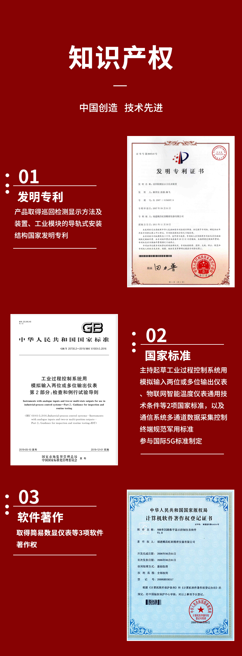 虹潤(rùn)公司是專(zhuān)業(yè)生產(chǎn)數(shù)顯表的國(guó)家專(zhuān)精特新“小巨人”企業(yè),生產(chǎn)的導(dǎo)軌式數(shù)顯儀表,具有全切換信號(hào)輸入,導(dǎo)軌壁掛共用,全隔離設(shè)計(jì),高抗干擾,變送輸出或RS485通訊等特點(diǎn)。產(chǎn)品獲得巡回檢測(cè)顯示方法及裝置、工業(yè)模塊的導(dǎo)軌式安裝結(jié)構(gòu)等2項(xiàng)國(guó)家發(fā)明專(zhuān)利,主持起草工業(yè)過(guò)程控制系統(tǒng)用模擬輸入兩位或多位輸出儀表、物聯(lián)網(wǎng)智能溫度儀表通用技術(shù)條件等2項(xiàng)國(guó)家標(biāo)準(zhǔn),,以及通信系統(tǒng)多通道數(shù)據(jù)采集控制終端規(guī)范軍用標(biāo)準(zhǔn),參與國(guó)際5G標(biāo)準(zhǔn)制定,取得簡(jiǎn)易數(shù)顯儀表等3項(xiàng)相關(guān)軟件著作權(quán)。產(chǎn)品廣泛應(yīng)用于電力、石化、冶金、化工、造紙、食品、輕工、制藥、熱處理、水處理、機(jī)械配套等各種工業(yè)現(xiàn)場(chǎng)。