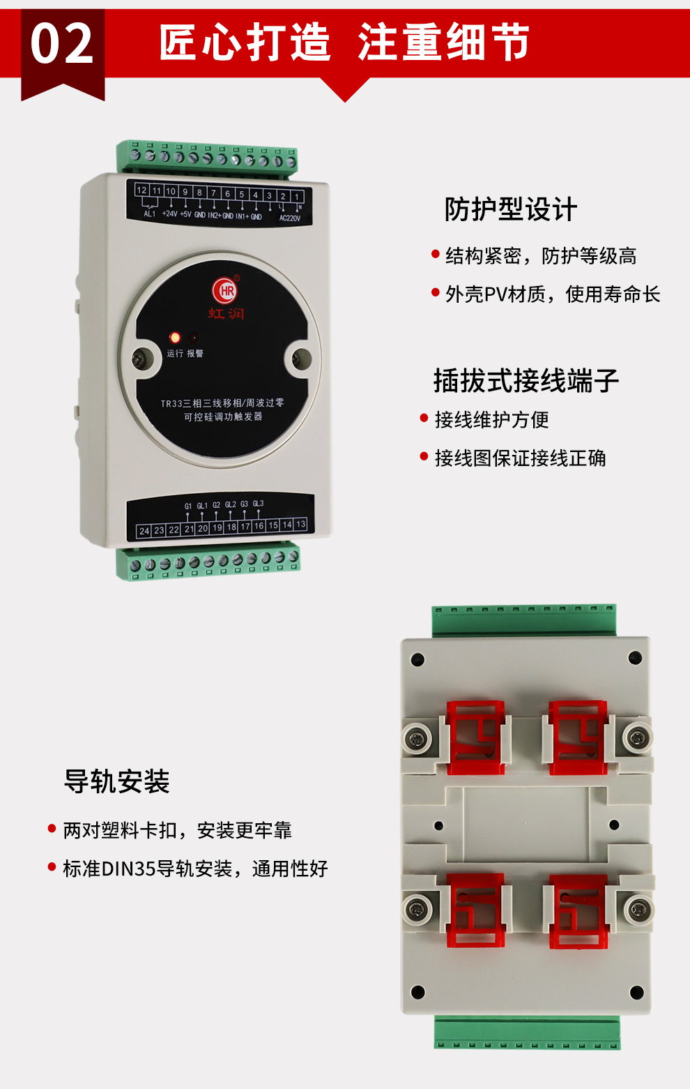 虹潤公司是專業(yè)生產(chǎn)移相觸發(fā)器的國家專精特新“小巨人”企業(yè),生產(chǎn)的移相觸發(fā)器,具有采用光電隔離設(shè)計,自動同步功能,過流保護技術(shù),電源缺相檢測,信號超限報警等特點。產(chǎn)品獲得巡回檢測顯示方法及裝置、儀表殼體等2項國家發(fā)明專利,主持起草工業(yè)過程控制系統(tǒng)用模擬輸入兩位或多位輸出儀表、物聯(lián)網(wǎng)智能溫度儀表通用技術(shù)條件等2項國家標準以及通信系統(tǒng)多通道數(shù)據(jù)采集控制終端規(guī)范軍用標準,參與國際5G標準制定,取得外置移相觸發(fā)器等2項相關(guān)軟件著作權(quán)。產(chǎn)品廣泛應(yīng)用于工業(yè)溫控、電極控制、航天軍工、電爐溫控、食品醫(yī)藥等諸多領(lǐng)域。