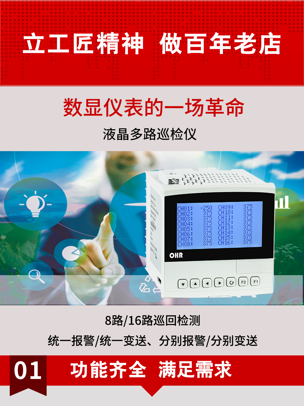 虹潤(rùn)公司是專業(yè)生產(chǎn)多路溫度巡檢儀的國(guó)家專精特新“小巨人”企業(yè),生產(chǎn)的液晶多路巡檢儀,具有8路/16路測(cè)量通道,全切換信號(hào)輸入,統(tǒng)一報(bào)警統(tǒng)一變送輸出,分別報(bào)警分別變送輸出,RS485/RS232通訊等特點(diǎn)。產(chǎn)品獲得巡回檢測(cè)顯示方法及裝置、儀表殼體等2項(xiàng)國(guó)家發(fā)明專利,主持起草工業(yè)過(guò)程控制系統(tǒng)用模擬輸入兩位或多位輸出儀表、物聯(lián)網(wǎng)智能溫度儀表通用技術(shù)條件等2項(xiàng)國(guó)家標(biāo)準(zhǔn),以及通信系統(tǒng)多通道數(shù)據(jù)采集控制終端規(guī)范軍用標(biāo)準(zhǔn),參與國(guó)際5G標(biāo)準(zhǔn)制定,取得液晶多回路測(cè)量顯示控制儀等4項(xiàng)相關(guān)軟件著作權(quán)。產(chǎn)品廣泛應(yīng)用于電力、石化、冶金、制藥、水處理、機(jī)械配套等各種工業(yè)現(xiàn)場(chǎng)。