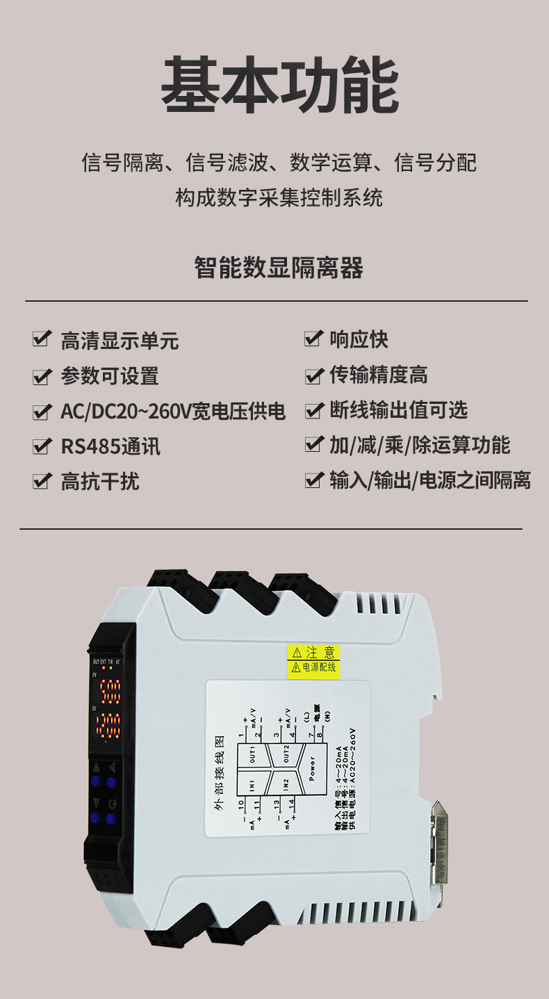 虹潤(rùn)公司是專業(yè)生產(chǎn)隔離器的國(guó)家專精特新“小巨人”企業(yè)。生產(chǎn)的導(dǎo)軌式智能隔離器 ,具有高清顯示單元,參數(shù)可設(shè)置,寬電源供電,響應(yīng)快,帶RS485通訊等特點(diǎn)。產(chǎn)品獲得信號(hào)隔離器、一種二端子模塊、無(wú)源信號(hào)隔離器等3項(xiàng)國(guó)家發(fā)明專利,主持起草現(xiàn)場(chǎng)設(shè)備工具(FDT)接口規(guī)范、工業(yè)過(guò)程測(cè)量和控制系統(tǒng)用隔離式安全柵、工業(yè)過(guò)程測(cè)量和控制系統(tǒng)用配電器等3項(xiàng)國(guó)家標(biāo)準(zhǔn),以及通信系統(tǒng)多通道數(shù)據(jù)采集控制終端規(guī)范軍用標(biāo)準(zhǔn),參與國(guó)際5G標(biāo)準(zhǔn)制定,取得智能隔離器等2項(xiàng)相關(guān)軟件著作權(quán)。產(chǎn)品廣泛應(yīng)用于電力、石化,冶金、制藥、水處理、機(jī)械配套等各種工業(yè)現(xiàn)場(chǎng)。