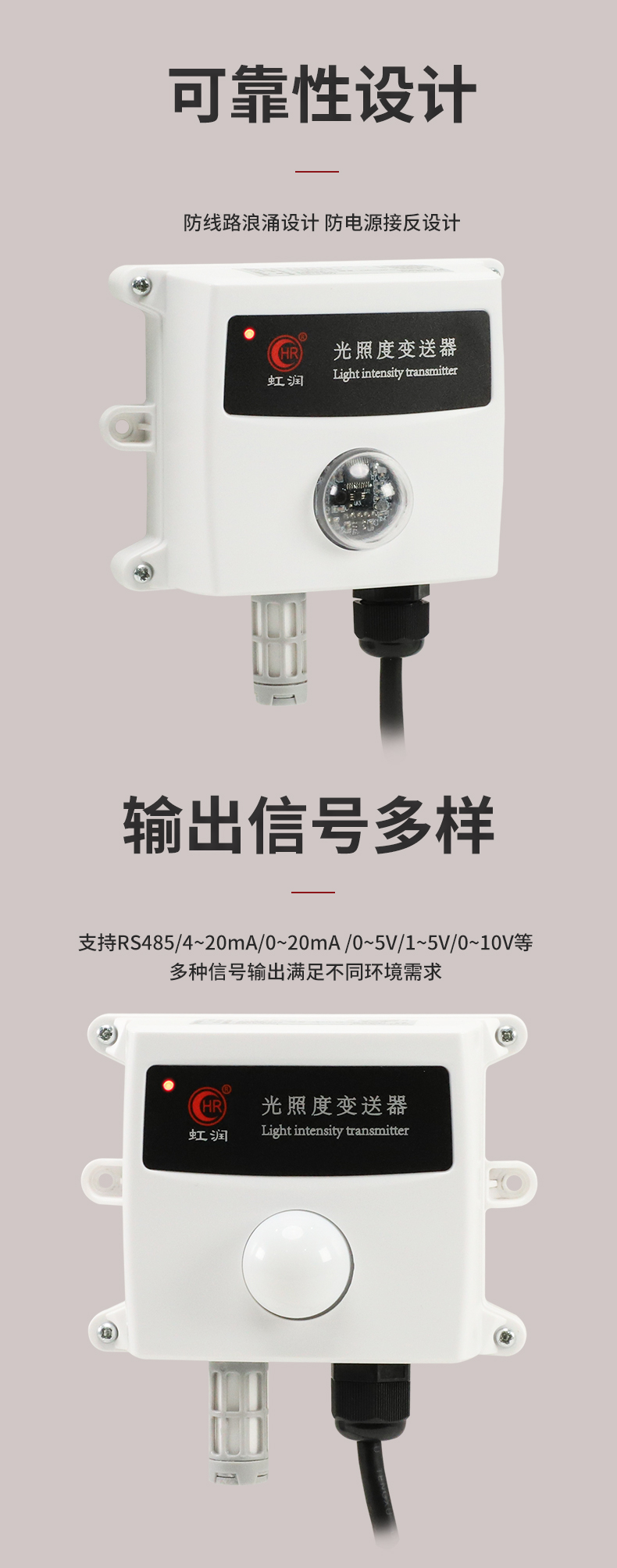 虹潤公司是專業(yè)生產(chǎn)環(huán)境監(jiān)測儀表的國家專精特新“小巨人”企業(yè)。生產(chǎn)的光照度變送器,具有高精度感光傳感器,響應(yīng)靈敏,準確度高,低功耗,模擬量變送輸出或RS485通訊等特點。產(chǎn)品獲得一種農(nóng)業(yè)監(jiān)控變送器、一種儀表電源等2項實用新型專利,主持起草現(xiàn)場設(shè)備集成等5項智能制造國家標準,以及現(xiàn)場設(shè)備工具(FDT)接口規(guī)范、物聯(lián)網(wǎng)總體技術(shù)智能傳感器特性與分類等2項國家標準,參與國際5G標準制定,取得農(nóng)業(yè)監(jiān)測變送器等3項相關(guān)軟件著作權(quán)。產(chǎn)品廣泛應(yīng)用于溫室大棚、花卉養(yǎng)殖、科研實驗、智能樓宇、戶外照明等環(huán)境場合對光照度的檢測。