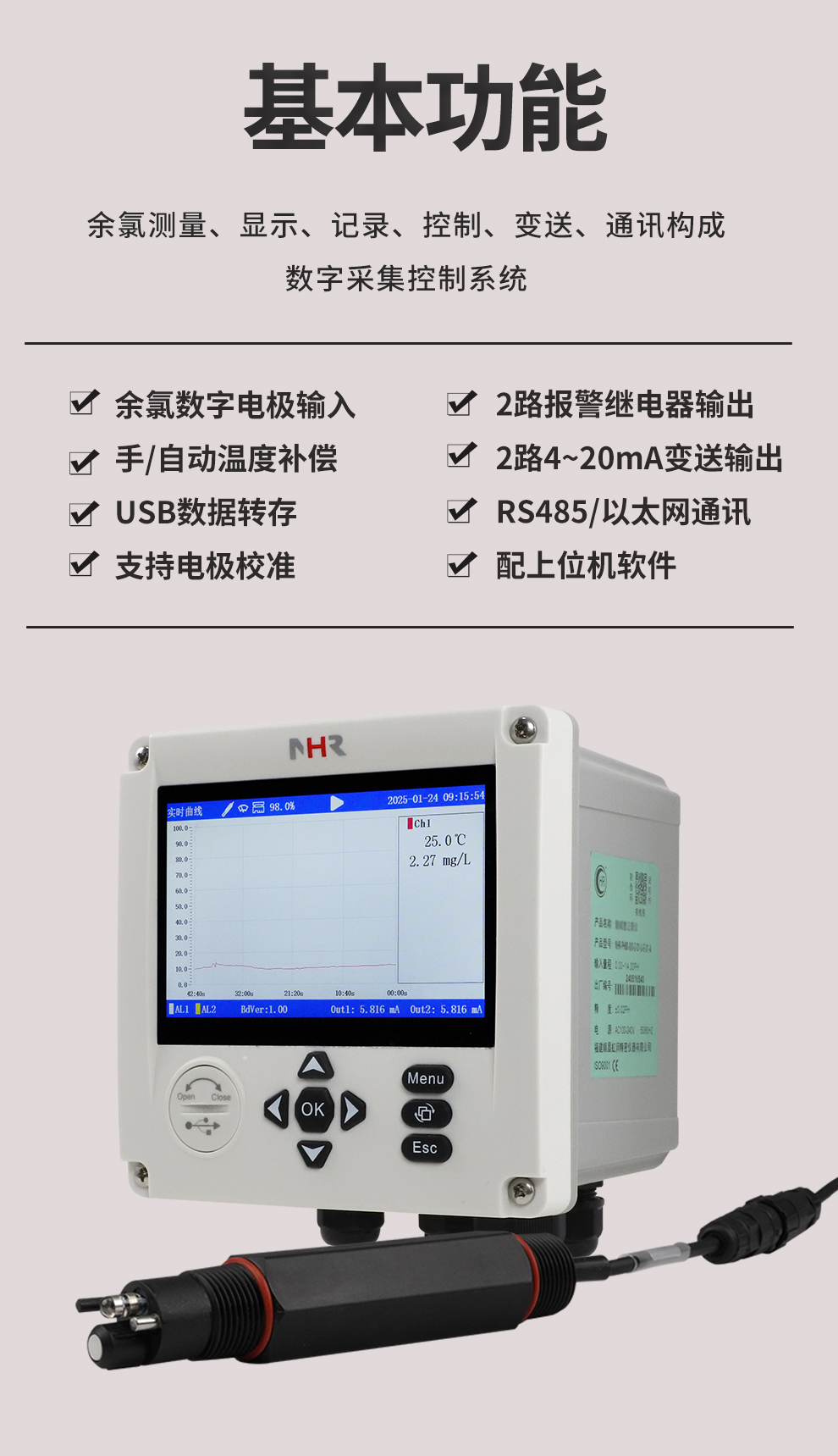 虹潤(rùn)公司是專業(yè)生產(chǎn)水質(zhì)分析儀的國(guó)家專精特新“小巨人”企業(yè)。生產(chǎn)的余氯記錄儀,具有彩色大屏顯示,測(cè)量精準(zhǔn)穩(wěn)定不跳字,數(shù)據(jù)記錄與轉(zhuǎn)存,RS485/以太網(wǎng)通訊,配套上位機(jī)管理軟件等特點(diǎn)。產(chǎn)品獲得一種平板無(wú)紙記錄儀、智能化控制器等2項(xiàng)國(guó)家發(fā)明專利;主持起草物聯(lián)網(wǎng)智能記錄儀表通用技術(shù)條件現(xiàn)場(chǎng)設(shè)備工具(FDT)接口規(guī)范.、過(guò)程分析技術(shù)系統(tǒng)等3項(xiàng)國(guó)家標(biāo)準(zhǔn),以及通信系統(tǒng)多通道數(shù)據(jù)采集控制終端規(guī)范軍用標(biāo)準(zhǔn),參與國(guó)際5G標(biāo)準(zhǔn)制定;取得余氯無(wú)紙記錄儀等3項(xiàng)相關(guān)軟件著作權(quán)。產(chǎn)品廣泛應(yīng)用于市政供水、泳池、污水處理、藥療衛(wèi)生、食品、水產(chǎn)養(yǎng)殖、工業(yè)用水處理等諸多領(lǐng)域。