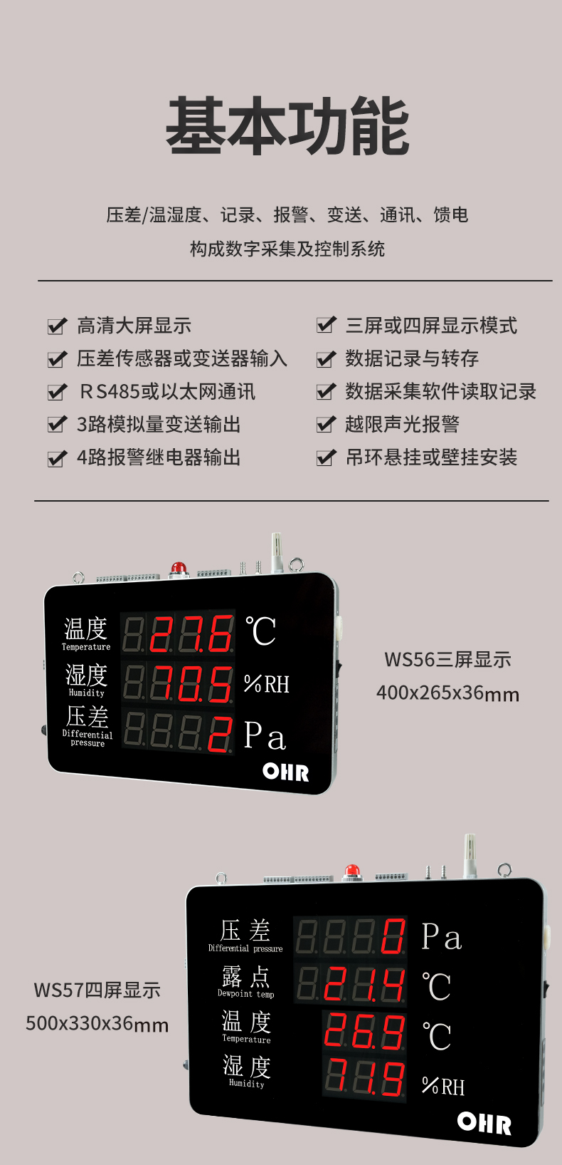 OHR-WS56/WS57系列大屏壓差溫濕度記錄儀