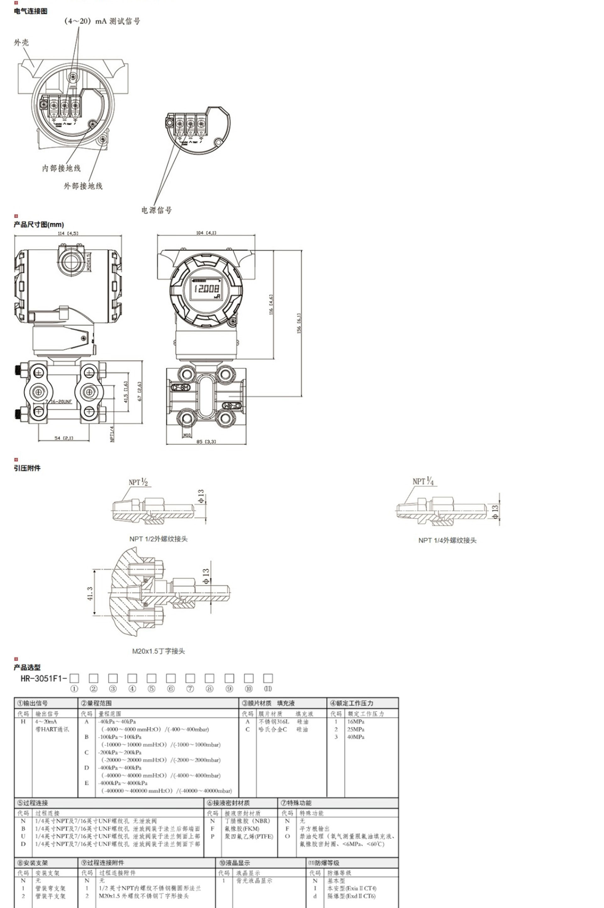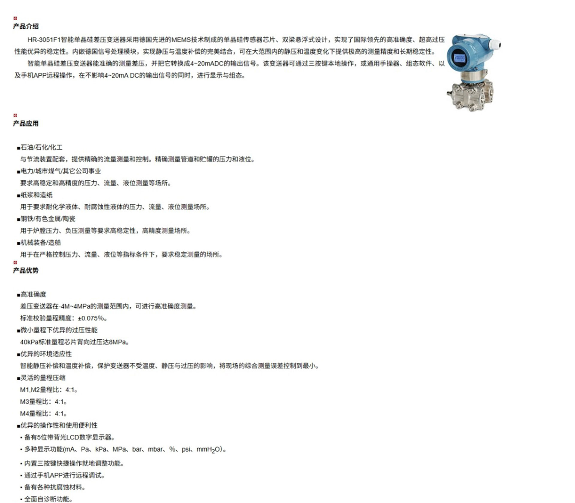 HR-3051F1智能單晶硅差壓變送器能準(zhǔn)確的測(cè)量差壓,并把它轉(zhuǎn)換成4~20mADC的輸出信號(hào)。該變送器可通過(guò)三按鍵本地操作,或通用手操器、組態(tài)軟件、以及手機(jī)APP遠(yuǎn)程操作,在不影響4~20mA DC的輸出信號(hào)的同時(shí),進(jìn)行顯示與組態(tài)。